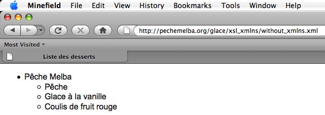 La présence du code suivant xmlns="http://www.w3.org/TR/xhtml1/strict" au sein de la déclaration <xsl:stylesheet/> provoque une erreur de rendu dans Firefox.